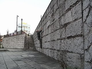 千葉市の県庁近くの都川に架かる大和橋の南詰めにある、小さな公園の側壁が登られています。花崗岩のブロックを積んだ垂直の壁です。