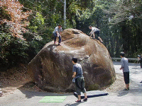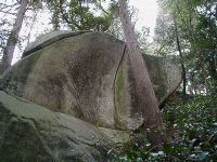 ボルダーエリアへは駐車場右奥の左回りの一方通行の周回道路からトンネルの先の上の駐車場(現在は車の進入が禁止されているので、駐車場左奥から道標に従って歩く)に行き、右側の茶店(冬場は営業していない)の前の道に入って、石段の途中から石倉方面への道標に従って右に少し下って行く。その先平らな道を行くと、尾根筋の開けた石のいっぱい有るちょっとした広場様の所に出るので、そこの脇の茂みの中の踏み跡(ベンチを背にして左側、上から3本目位の踏み跡)を下って行くとすぐにギル岩がある。