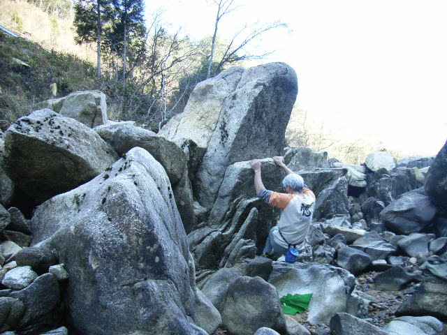 大津市の大戸川に点在するボルダーでの一齣です。