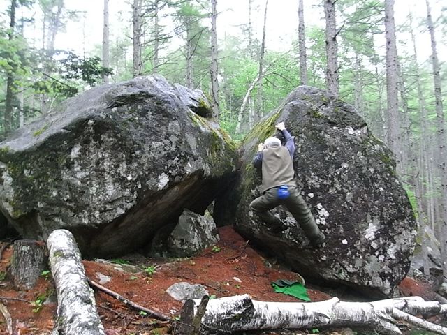瑞牆山・金山沢に点在するボルダーでの一齣です。雨の中、無理して登っています。