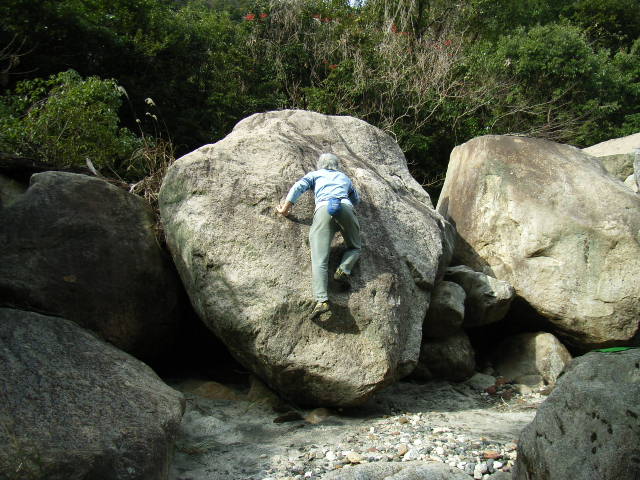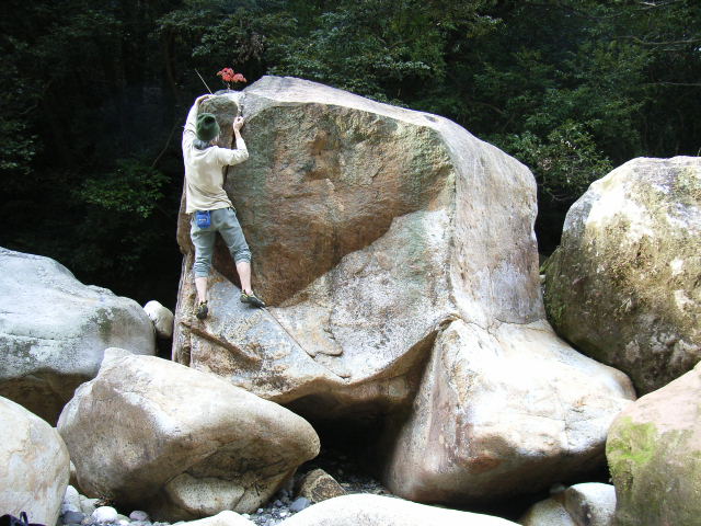鹿児島県垂水市の猿ヶ城渓谷に点在するボルダーでの一齣です。