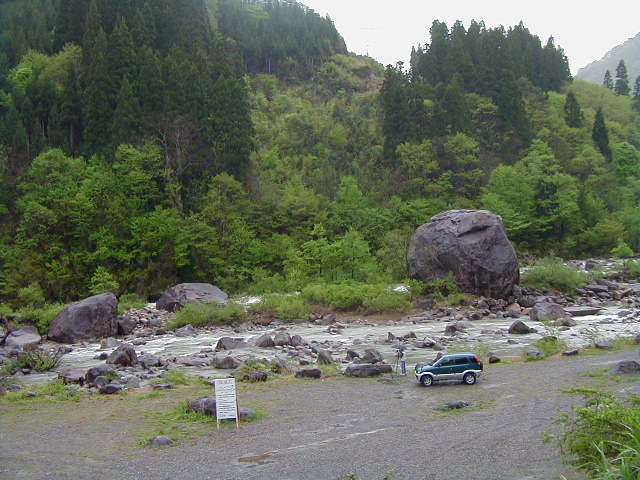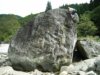 ![]() 上流から見る百万貫岩 右面と裏面に課題がある。 |