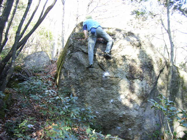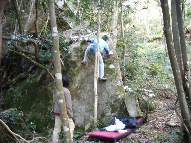 山口市の東にある白石山の山中に点在するボルダーでの一齣です。