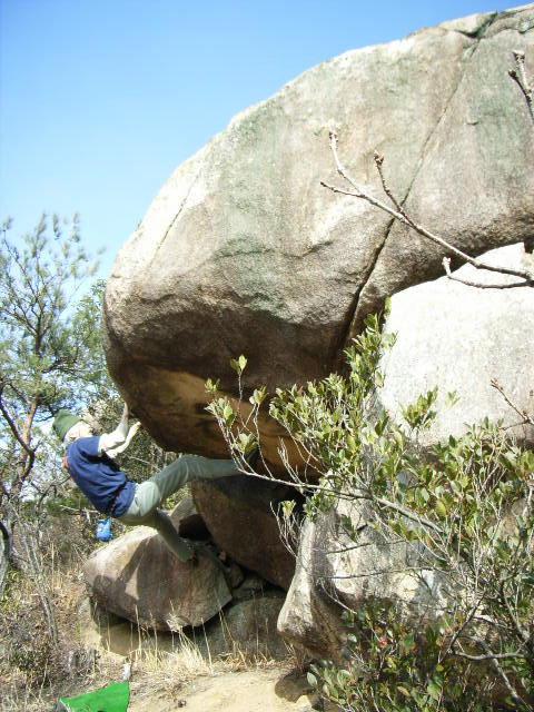 山口市の陶ヶ岳の山中に点在するボルダーでの一齣です。