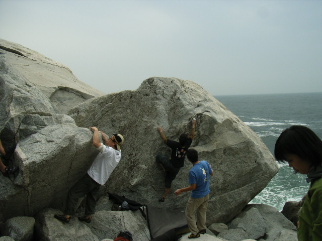 東北の某島の海岸に点在するボルダーでの一齣です。