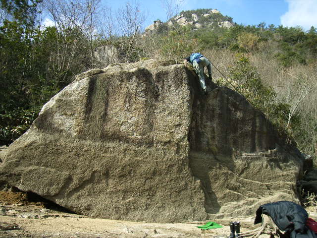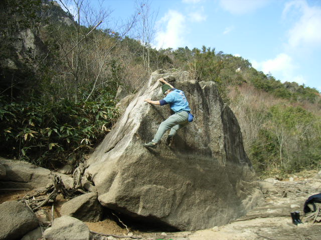 広島県と山口県の県境にある弥栄峡内の遊歩道脇に点在するボルダーでの一齣です。